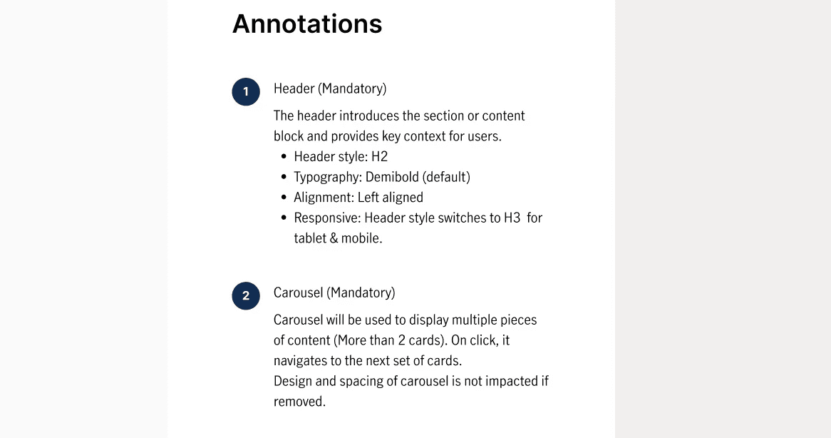 Each component was documented and annotated in Figma with clear guidance for responsive behavior, accessibility, and authoring rules. Ensuring that authors could build pages confidently within AEM and that developers had unambiguous references for implementation and QA.