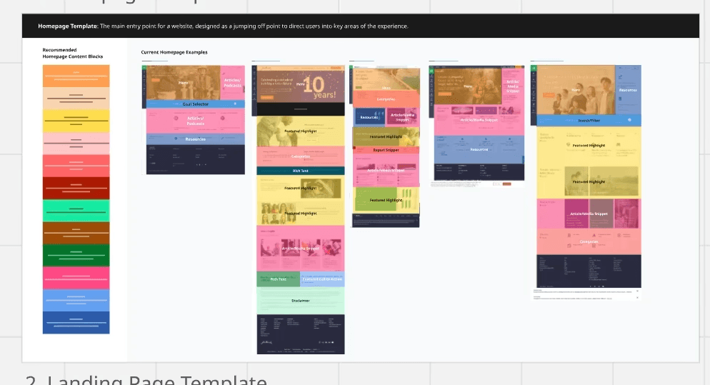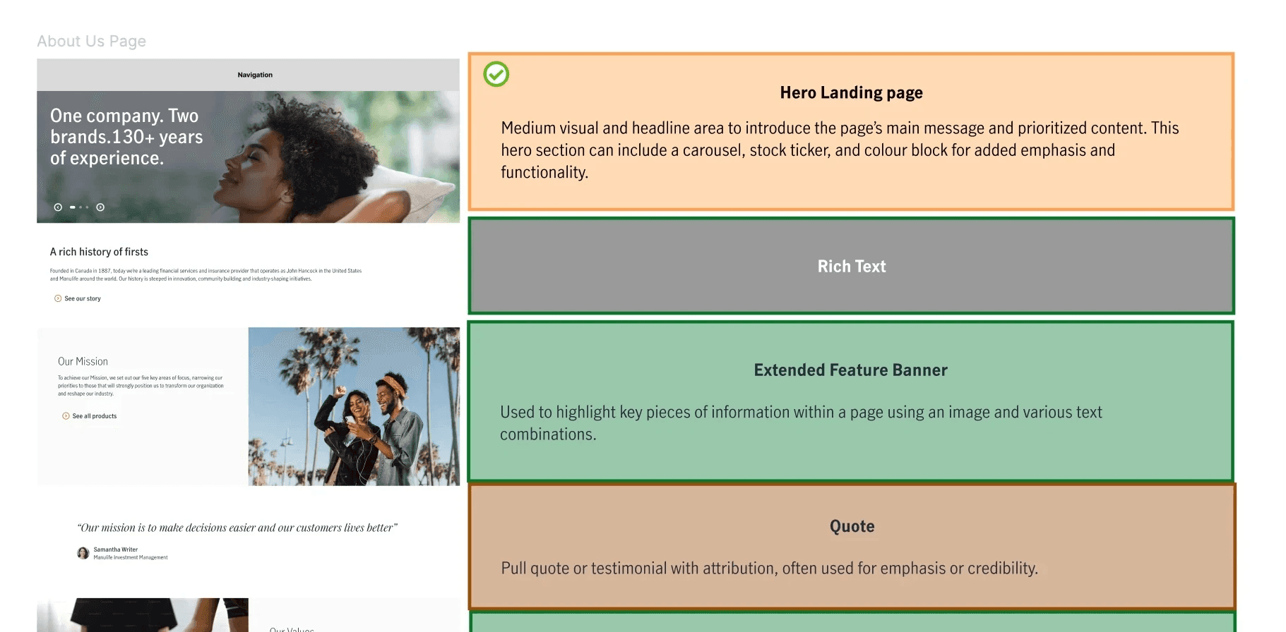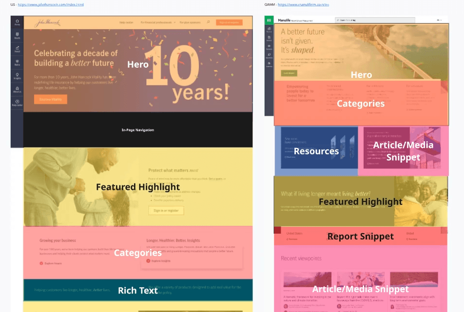 We began by mapping content blocks on existing manulife.com pages. This process revealed recurring design patterns and inconsistencies that created friction. By breaking each page into discrete blocks, we could evaluate which elements could be reused, refined, or reimagined for future templates.